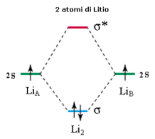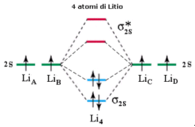Si considerino ora 4 atomi di Litio legati. In questo caso si formeranno 2 orbitali di legame (σ2s) saturi e due orbitali di antilegame (σ2s*) vuoti. Questo sistema a 4 atomi è più stabile del precedente essendo caratterizzato da un maggior numero di orbitali di legame saturi.