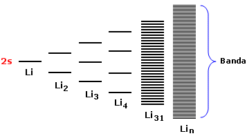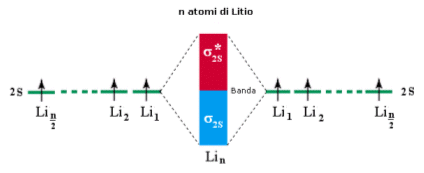 Se estendiamo il ragionamento ad n atomi otterremo un sistema costituito da n/2 orbitali di legame (σ2s) saturi ed n/2 orbitali di antilegame (σ2s*) vuoti. Gli orbitali di legame saturi e quelli di antilegame vuoti si dispongono su livelli energetici talmente vicini da formare una banda continua di energia.