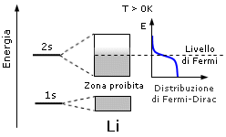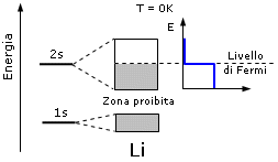 Dunque a zero gradi kelvin gli elettroni del Litio, si trovano tutti ad energie minori dell'energia di Fermi, che si colloca a metà della banda 2s