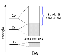 Questo accade per il Litio e per tutti i metalli che presentano una banda di valenza semisatura, ma è possibile anche per un metallo come il Berillio che, pur avendo la banda 2s completamente satura (sia quella di legame che quella di antilegame), presenta la banda 2s parzialmente sovrapposta alla banda 2p vuota che diventa dunque la banda di conduzione