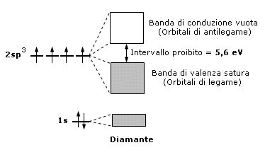 La caratteristica di un isolante è quindi quella di possedere una banda di valenza completamente satura separata dalla banda di conduzione vuota da un intervallo di energia proibito molto maggiore della tipica energia termica. In tali condizioni la temperatura non è in grado di promuovere un elettrone nella banda superiore che è vuota e dunque, in presenza di un campo elettrico, non si ha passaggio di coerente. Un tipico isolante è il diamante in cui l'intervallo di energia proibito è circa duecento volte l'energia termica a temperatura ambiente. Alcuni fisici separano gli isolanti dai semiconduttori ponendo arbitrariamente pari a 4 eV le dimensioni energetiche della zona proibita.