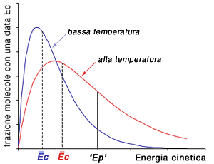 Nel grafico è mostrata la distribuzione delle energie cinetiche delle particelle di un liquido (distribuzione di Maxwell-Boltzmann), a due diverse temperature. Alla temperatura più elevata, l'Ec delle particelle si