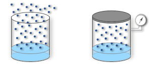 Nel recipiente chiuso si raggiunge un equilibrio fra la fase liquida e la fase gassosa. La pressione del gas all'equilibrio si definisce pressione di vapore. La pressione di vapore è una costante caratteristica di ogni liquido: dipende dalla temperatura ed è indipendente dal volume del liquido. |