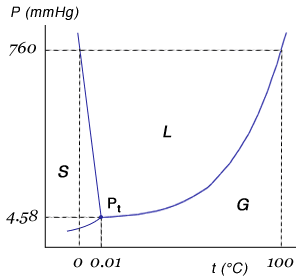 Diagramma di stato dell'acqua. S, L, G indicano le regioni in cui la sostanza è presente unicamente in fase solida, liquida, gassosa. Entrambe le scale del grafico sono distorte in modo da mettere in evidenza gli aspetti particolari degli equilibri, quali il punto triplo (Pt) e la pendenza negativa della curva solido-liquido. Quest'ultimo aspetto è caratteristico dell'acqua e di pochissime altre sostanze. La pendenza è negativa poiché il punto di fusione dell'acqua diminuisce, sia pur leggermente, all'aumento della pressione. Tale comportamento è dovuto al fatto che l'acqua, per effetto dei numerosi legami a H che ne caratterizzano la fase solida, ha un volume specifico (l'inverso della densità) maggiore allo stato solido che allo stato liquido. Poiché il ghiaccio occupa un volume maggiore del liquido, un aumento di pressione 'favorisce' la fase liquida che tende ad occupare un volume minore. Oltre i 100°C, la curva di equilibrio liquido-vapore continua a salire sempre più rapidamente fino al cosiddetto punto critico dell'equilibrio di fase (non mostrato). Questo punto corrisponde alla temperatura di 374°C (temperatura critica dell'acqua), e alla pressione di circa 218 atm. Al di sopra della temperatura critica, l'acqua esiste unicamente allo stato di vapore. La curva di equilibrio liquido-vapore termina in questo punto, dato che oltre non vi è più confine di fase fra liquido e vapore. |