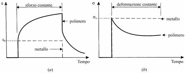 Altra particolarità dei polimeri è che hanno un comportamento viscoelastico come quello del legno, se c'è un o sforzo costante per un dato istante, avremo una deformazione elastica istantanea e poi una deformazione viscosa che evolve nel tempo, il recupero della deformazione istantanea è totale, più lento è quello della deformazione viscosa che si recupera dopo un po' di tempo ma si recupera tutta.