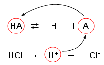 Ora se aggiungiamo alla soluzione un acido forte, gli ioni H+ prodotti dalla sua completa dissociazione tendono a combinarsi con gli ioni A- della soluzione tampone per dare l'acido debole indissociato HA. Naturalmente il processo risulta efficiente solo se in soluzione è presente una elevata concentrazione di ioni A-.