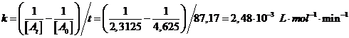 Usiamo ora la relazione integrata della velocità per le reazioni di secondo ordine per calcolare la costante di velocità