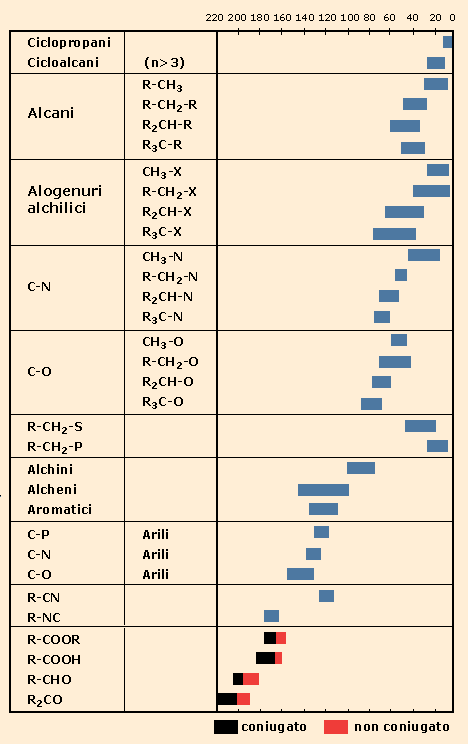 Nella tabella seguente vengono riportati in generale gli spostamenti chimici del 13C mentre come nel caso del protone si consiglia l'uso di tabelle più dettagliate reperibili nei più comuni testi che trattano di spettroscopia di risonanza magnetica nucleare.