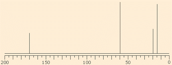 Lo spettro dell'acetato di etile riportato in figura 4 presenta quattro picchi relativi ai quattro carboni presenti nello scheletro molecolare. Alle frequenze più basse, nella parte destra dello spettro, troveremo i carboni ad ibridazione sp3 (più schermati) ed all'interno di questo gruppo gli spostamenti chimici saranno influenzati dall'elettronegatività dei gruppi o atomi adiacenti. Nel caso dell'acetato di etile a 15 ppm troveremo il segnale relativo al metile adiacente al metilene, a 20 ppm il metile adiacente al gruppo carbonilico ed a 60 ppm il segnale relativo al gruppo metilenico che risulta essere il più deschermato in quanto direttamente legato ad un atomo elettronattrattore. Possiamo quindi affermare che il gruppo carbonilico ha un effetto elettronattrattore inferiore all'ossigeno cioè è meno deschermante. Se confrontiamo il 13C ed lo spettro 1H dell'acetato di etile riportato nella figura1 della lezione 3 è possibile notare come esista una stretta analogia tra gli spostamenti chimici osservato per il protone e quelli osservati per il carbonio. Nella parte sinistra dello spettro troveremo i carboni a ibridazione sp2 di tipo etilenico e aromatico (vedere anche la tabella di figura 3). Nel caso dell'acetato di etile in questa zona troveremo il segnale relativo al carbonio del gruppo carbonilico che risuona a frequenze particolarmente elevate (170 ppm) in quanto legato ad un elemento elettronattrattore come l'ossigeno.