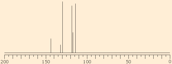 Gli ultimi due spettri si riferiscono a due anelli aromatici. Il primo con sostituzione asimmetrica, la 2,5-dicloro-anilina, presenta nello spettro 6 segnali distinti (Fig. 7), mentre il secondo relativo alla N-etilanilina presenta nella zona degli aromatici quattro segnali in quanto i carboni in orto ed in meta rispetto al sostituente sono equivalenti a due a due (Fig. 8). L'attribuzione dei segnali va fatta in base agli effetti mesomeri ed induttivi dei diversi sostituenti ed esula dagli scopi didattici del corso per biotecnologi.