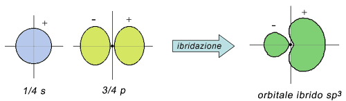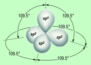 Nel rispetto della regola che vuole che gli orbitali si dispongano nello spazio alla massima distanza l'uno dall'altro per minimizzare la repulsione elettrostatica fra le nubi elettroniche, gli orbitali ibridi sp3 si orientano secondo una geometria tetraedrica, ovvero formando fra loro angoli di 109° 28'.