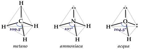 Geometria molecolare del metano, dell'ammoniaca e dell'acqua |