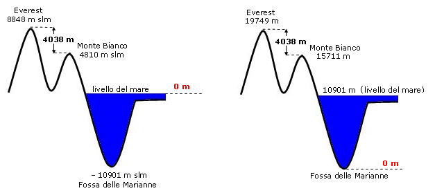 Cambiando la posizione dello zero, ad esempio ponendola in corrispondenza della Fossa delle Marianne, cambiano tutte le quote (ad esempio ora L'Everest è alto 19749 m), ma rimangono immutati i dislivelli (ad esempio la differenza di quota tra l'Everest ed il Monte Bianco rimane di 4038 m)