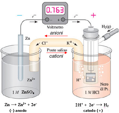 Poiché si osserva che lo zinco si ossida cedendo elettroni agli ioni H+ che si riducono ad idrogeno gassoso (possiamo verificarlo osservando che, come conseguenza della diminuzione della concentrazione degli ioni H+, il pH della soluzione catodica aumenta), lo zinco funge da anodo mentre l'idrogeno da catodo.