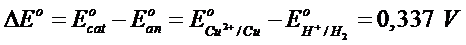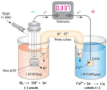 Poiché in questo caso è l'idrogeno che si ossida cedendo elettroni al rame (possiamo verificarlo osservando che, come conseguenza dell'aumento della concentrazione degli ioni H+, il pH della soluzione anodica diminuisce), l'idrogeno funge da anodo mentre il rame da catodo.