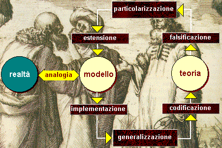 Fig.2.1 Schematizzazione dei processi che portano alla costruzione e al mantenimento di un modello scientifico. Lo schema rappresenta una elaborazione delle teorie di Popper: la realtà (cioè uno o più fenomeni reali), mediante processi di analogia, viene rappresentata in un modello; questo viene implementato (costruito razionalmente), generalizzato (anche ad altri fenomeni analoghi) e codificato (mediante strumenti e conoscenze matematiche viene espresso in modo 'formale'); questa sequenza di processi porta ad una teoria. Ogni teoria deve essere poi falsificata (messa in crisi con nuove esperienze o utilizzando nuovi dati sperimentali), particolarizzata (applicata al fenomeno specifico) ed estesa (ad altri fenomeni). Se questa sequenza regge, il modello viene mantenuto; se non regge il modello deve essere adeguato (modificandolo) oppure può essere necessario anche cambiarlo totalmente. |