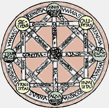 Fig.2.2 Rappresentazione delle categorie del mondo naturale secondo Aristotele e delle possibili trasformazioni che in esso avvengono. Sono rappresentati i quattro elementi di Aristotele: fuoco (IGNIS), aria (AER), acqua (AQUA), terra (TERRA). Sono indicati i passaggi da un elemento all'altro per somma (SUMMA) o perdita (REMISSA) di una delle quattro qualità: caldo (CALIDITAS), umido (HUMIDITAS), freddo (FRIGIDITAS), secco (SICCITAS). Inoltre compaiono le combinazioni possibili e impossibili (COMBINATIO POSSIBILIS, verticali od orizzontali, e IMPOSSIBILIS, diagonali) fra diverse qualità. (G.W.Leibniz in Dissertatio de arte combinatoria, 1666) |