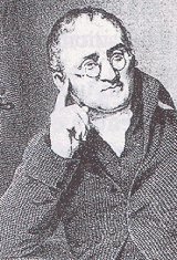 Fig.2.3 Un ritratto di John Dalton John Dalton (1766-1844) scienziato inglese, fondatore dell'atomistica chimica moderna; usando miscele gassose (inizia con lui quella che viene chiamata 'chimica pneumatica', dal greco 'pneuma' pneuma, aria), studia e chiarisce le relazioni ponderali fra elementi; nel 1801-2 enuncia la 'legge delle pressioni parziali'; afferma, sbagliando (anche gli errori sono importanti, purché vengano poi riconosciuti!), che il numero di particelle di vari gas in un dato volume sia diverso; afferma che è necessario determinare numero e peso di tutti gli elementi, che gli atomi di elementi diversi sono diversi per qualità e peso specifico, che atomi di una stessa sostanza sono identici, che atomi diversi hanno la capacità di combinarsi in rapporti diversi (giustificando la legge delle 'proporzioni multiple'), che gli atomi sono inalterabili e indivisibili (giustificando la 'legge della conservazione di massa' di Lavoisier), che atomi di sostanze diverse hanno pesi atomici diversi. |