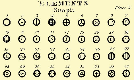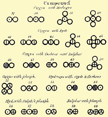 Egli usò inoltre simboli nuovi per identificare gli atomi, ma anche per alcuni composti, poiché non esistevano ancora metodi per individuarli come tali, per esempio KOH e NaOH; adottò anche un modello simbolico per mostrare che gli atomi potevano unirsi in rapporti diversi, pur immaginando 'molecole' assolutamente improbabili e, alla luce delle attuali conoscenze, impossibili.