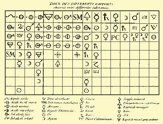 Fig.2.9 Altro esempio di 'Tabula affinitatum', detta anche 'Table de rapports', tratta dalla famosa 'Encyclopédie ou Dictionnaire raisonné des sciences des arts et des métiers' di Diderot e D'Alembert, edita a Lucca 1758-1776 Il metodo di lettura è lo stesso e uguale è la simbologia. |