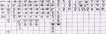 E' interessante notare che molti metalli utilizzano simboli astrologici di pianeti, della luna e del sole: l'oro ha il simbolo del sole (b9), l'argento quello della luna (b5), il ferro quello di Marte (c2), il rame quello di Venere (b4), il piombo quello di Saturno (c4), lo stagno quello di Giove (b2), il mercurio quello diMercurio (c5).