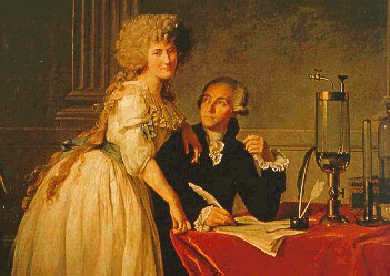 Fig.2.11 Un famoso ritratto di Lavoisier con la moglie, opera di Jacques-Louis David (ora al Metropolitan Museum of Art di New York) Antoine Laurent Lavoisier (1743-1794): chimico francese, fu ghigliottinato alla fine della Rivoluzione Francese; studia le reazioni chimiche e formula il principio della conservazione della massa nelle reazioni chimiche; genialmente riesce a coordinare in un sistema razionale esperienze e teorie parziali di molti scienziati europei, creando le basi della 'chimica' propriamente detta; corregge, benché a fatica, data la diffidenza del mondo scientifico verso i cambiamenti, molti errori concettuali (per esempio la teoria del flogisto, ancora imperante fra esìmi chimici anche dopo la sua morte, per esempio Stahl). |