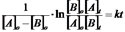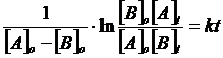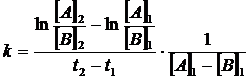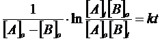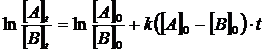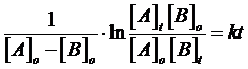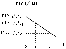 Se la reazione segue una cinetica di secondo ordine del tipo v = k[A][B], riportando in un grafico l'andamento del logaritmo del rapporto delle concentrazioni delle due specie chimiche in funzione del tempo si ottiene una retta di pendenza k([A]0 - [B]0)