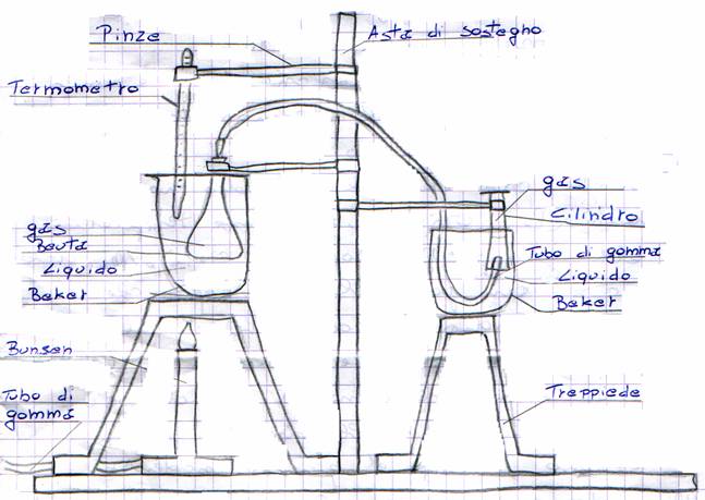 Per svolgere quest'esperienza dobbiamo prima di tutto prendere i seguenti strumenti: due treppiedi che ci serviranno per sorreggere i due beker contenenti acqua, un termometro per misurare la temperatura del beker contenente la beuta che a sua volta dovrà contenere dell'aria, un'asta di sostegno, alcune pinze, un bunsen che ci servirà per scaldare l'acqua, un tubo di gomma e un cilindro che dovrà contenere l'aria dilatata. Tutti questi strumenti o pezzi vanno montati come nel disegno. A questo punto l'esperienza può cominciare: abbiamo messo il bunsen sotto il beker contenente la beuta e, riscaldando l'acqua in cui essa era immersa ci siamo accorti che l'aria all'interno della beuta, dilatandosi, passava per il tubo di gomma finendo nell'altro cilindro. Il cilindro essendo graduato misurava l'aria che arrivava dalla beuta. Questa misura dell'aria andava fatta ogni due- tre gradi del termometro. Noi per un po' l'abbiamo fatta però, ad un certo punto ci siamo accorti che l'aria che arrivava nel cilindro era minore di quella che arrivava alla stessa temperatura agli altri gruppi e non capivamo perché. Per fortuna prima del suono della campanella abbiamo capito che l'aria nel cilindro era poca perché il tubo di gomma inserito nel tappo che chiudeva la beuta era stato messo male e quindi usciva dell'aria che invece sarebbe dovuta andare nel cilindro. Per colpa di questo incidente abbiamo dovuto smetter di fare l'esperimento e di raccogliere dati, quindi non possiamo fare il grafico perché come si è detto non abbiamo i dati.