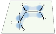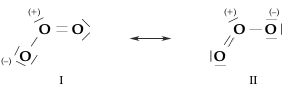 Con questa rappresentazione, tutti gli atomi raggiungono la configurazione otteziale. Le due strutture sono perfettamente equivalenti: ciascuna di esse dà pertanto lo stesso contributo (50%) all'ibrido di risonanza. Ciascuno dei due legami con l'ossigeno 'centrale' è intermedio ad un legame semplice e un legame doppio (ordine di legame 1.5). Tutto ciò implica che tutti e tre gli atomi di ossigeno abbiano ibridazione sp2. La molecola è quindi planare: i due legami σ e cinque doppietti solitari giacciono sullo stesso piano; tre orbitali p puri, uno per ciascun atomo, perpendicolari al piano, si sovrappongono a formare un unico orbitale π delocalizzato sull'intera molecola, che ospita 4 elettroni. Per effetto della particolare distribuzione elettronica e della geometria angolare della molecola, l'ozono ha un momento dipolare non nullo, nonostante sia costituito da atomi dello stesso elemento. La correttezza di questa rappresentazione è confermata dai dati sperimentali relativi alle distanze e all'angolo di legame. Ciascuno dei due legami misura infatti 1.37 Å, un valore esattamente intermedio a quelli previsti per un legame semplice e per un legame doppio ossigeno-ossigeno. L'angolo di legame è invece 117°, molto prossimo al valore atteso per una geometria planare-triangolare risultante dall'ibridazione sp |