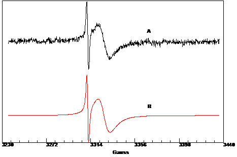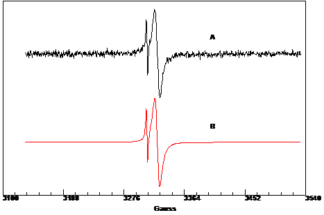 Figura 2. : Spettro EPR di CoCl2(N,N′-C12H6N2O2-O,O′)CrCl2(THF)2 a294 K; A) sperimentale, B) simulato.