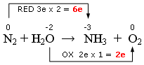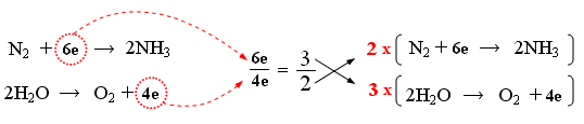 In altre parole i due atomi di azoto che si riducono, acquistando ciascuno 3 elettroni, catturano complessivamente 6 elettroni, mentre l'atomo di ossigeno presente nell'acqua, che si ossida, perde in tutto due elettroni.