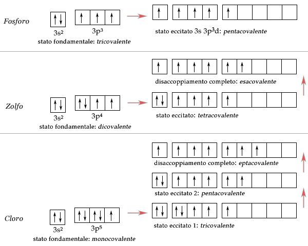 Per effetto della promozione degli elettroni negli orbitali d (vedi figura), gli elementi del 3° periodo potranno presentare covalenze diverse*: