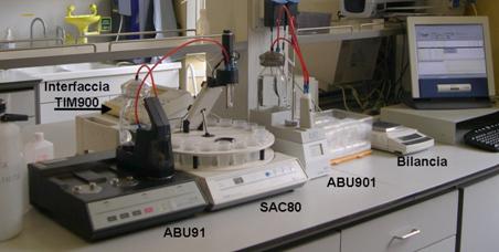 In figura 19 si può vedere il sistema di titolazione composto dall'interfaccia TIM900 connessa al personal computer, alle burette ABU901 da 2 mL e ABU91 da 1 mL, l'autocampionatore SAC80 e la bilancia tecnica per la misura gravimetrica del volume di campione titolato attualmente in uso con il programma wAlk05 nel laboratorio del CNR ISE di Verbania Pallanza.