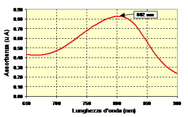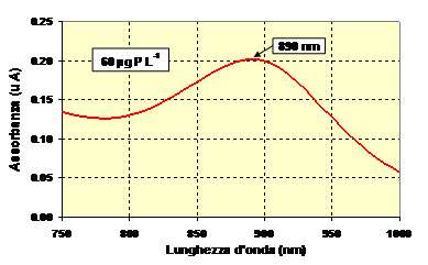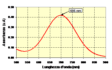 In particolare, lo ione N-NH4 in presenza del catalizzatore sodio nitroprussiato lo ione ammonio reagisce con il gruppo fenolico presente nel sodio salicilato; l'azione ossidante del sodiodicloro isocianurato porta alla formazione del composto blu indofenolo il cui spettro presenta un massimo di assorbanza alla lunghezza d'onda di 695 nm (Fig. 20).