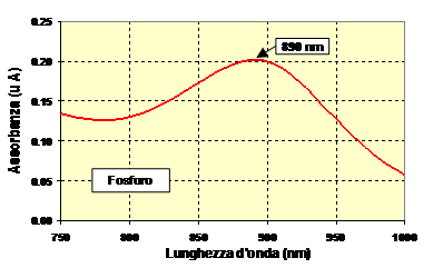Per il fosforo reattivo P-PO4 la determinazione si basa sulla reazione dell'ortofosfato con l'ammonio molibdato ed il potassio antimonio tartrato con formazione del complesso antimonio fosfomolibdico, a sua volta ridotto dall'acido L-ascorbico al colorante blu di molibdeno il cui spettro di assorbimento presenta il massimo di assorbanza a 890 nm (Fig. 21).
