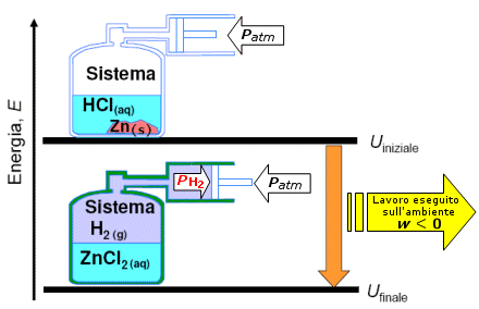 Durante la reazione si forma però una mole di idrogeno gassoso. Il sistema si espande compiendo un lavoro contro il peso dell'atmosfera sovrastante.