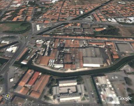 2. fase (anni '80): edifici in struttura leggera a saturazione delle aree ancora disponibili ed estensione dietro la parte esistente, lato canale. Annessione al sito del casale contadino su via Montramito.