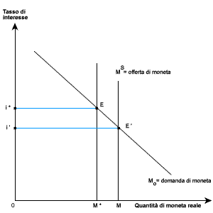 Prendiamo la figura seguente, raffigurante l'equilibrio nel mercato della moneta, con il valore d'equilibrio del tasso d'interesse i*, corrispondente al punto E.