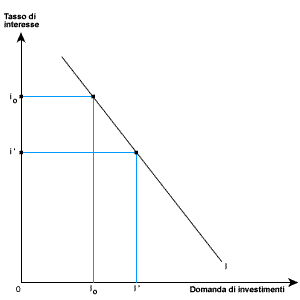 La domanda di investimenti in beni capitali è funzione inversa del tasso d'interesse, perché più è alto i e più è oneroso prendere dei finanziamenti per acquistare le macchine necessarie alla produzione. Viceversa, più è basso i e più è vantaggioso prendere finanziamenti da utilizzare per gli investimenti nella produzione.