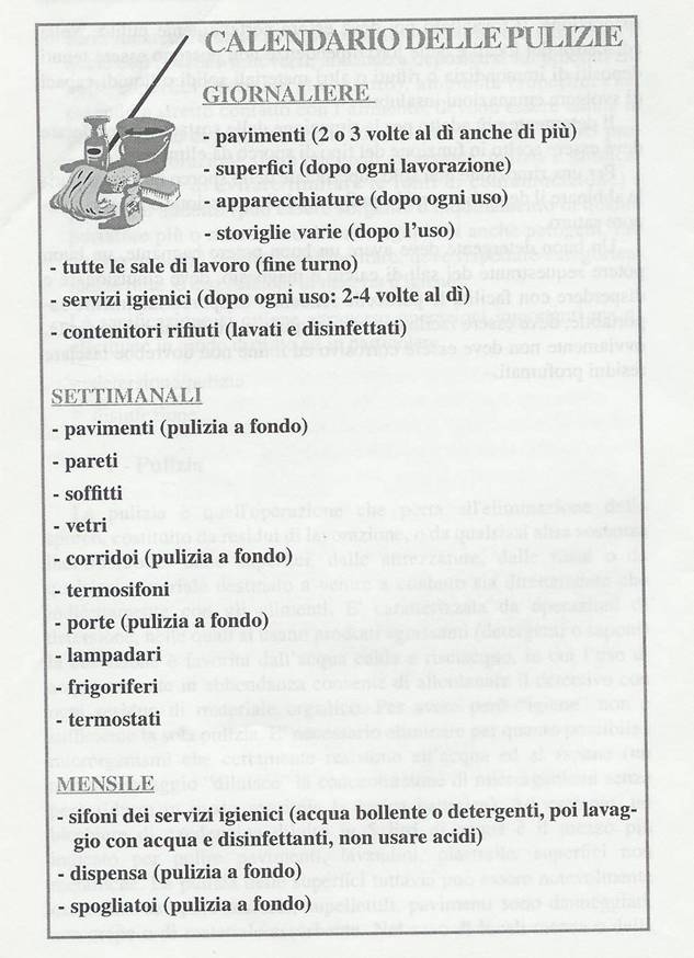 q Piani di lavoro mensili, settimanali e giornalieri per le operazioni di pulizia e di preparazione dei pasti, per l'acquisto e lo stoccaggio degli alimenti.