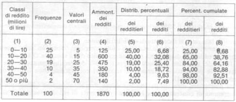 Riferiamoci a una distribuzione di redditi e precisamente a quella della seg. Tab. 7 è calcolato anzitutto (col. 4) il reddito totale di ogni classe; (moltiplicando il valore centrale per la frequenza; ma spesso esso è già dato).