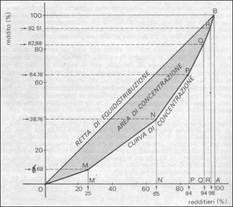 Si può allora dire che la concentrazione è tanto maggiore quanto più il diagramma di concentrazione è lontano dalla retta di equidistribuzione OB e vicino alla spezzata OAB.
