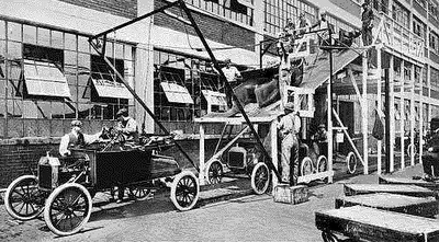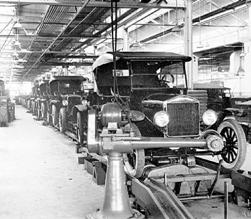 La brillante idea di Ford prese avvio dallo stabilimento di Highland Park a Detroit, dove fu introdotta per la prima volta una linea di montaggio in movimento. Essa consisteva di due strisce di lamiera che percorrevano per intero lo stabilimento. All' estremità della linea, le strisce montate su un nastro giravano sotto il pavimento e ritornavano all'inizio. Dal momento che occorrevano soltanto un nastro e un motore elettrico per metterlo in funzione, il costo era minimo e consentiva di ridurre notevolmente la durata del ciclo lavorativo. Il lavoratore risparmiava infatti tempo rimanendo fermo nella sua postazione, evitando in questo modo la creazione di ingorghi con altri colleghi nonché ulteriori tipi di inconvenienti dovuti agli spostamenti. Si deve poi tenere presente che la catena di montaggio scandiva precisi ritmi di lavoro che gli operai erano per forza di cose obbligati a seguire se non volevano rischiare di ostruire l' intera produzione.