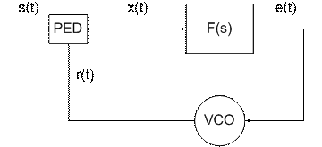 Come si vede il PLL è costituito da 3 blocchi: il PED, il filtro d'anello e l'oscillatore controllato in tensione (VCO).