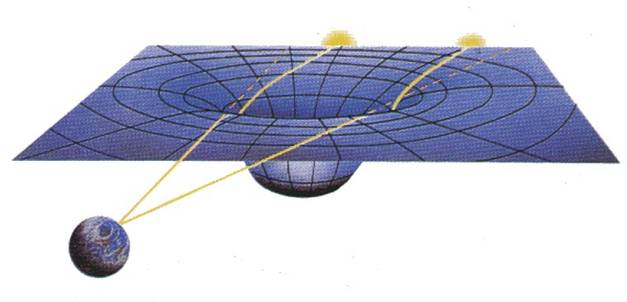 Quindi la causa diretta della caduta di un corpo verso un'altro di massa maggiore o le traiettorie curve dei pianeti sono un effetto diretto della curvatura dello spazio-tempo.