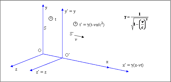 Figura 3.2 - Per due sistemi di riferimento inerziali S e S', che si muovono l'uno rispetto all'altro con velocità v lungo l'asse x, le trasformate che permettono di passare dalle coordinate di un sistema all'altro sono le trasformate di Lorentz che tendono alle trasformate Galileiane per v<<c.