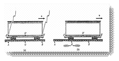 Per spiegarlo, consideriamo un vagone che si muove con velocità uniforme mentre due fulmini ne colpiscono gli estremi, lasciando due tracce nel vagone e sul terreno. Chiamiamo con A e B le tracce sul terreno, A' e B' le tracce sul vagone. Consideriamo un osservatore posto in O' che si trova a bordo del vagone a metà strada tra A' e B', e un osservatore posto in O a terra che si trova a metà strada tra A e B.