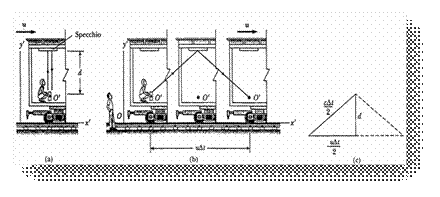 Consideriamo un veicolo in moto verso destra con velocità u. Uno specchio è piazzato sul soffitto del veicolo e un osservatore in O' tiene in mano un laser a distanza d dallo specchio.
