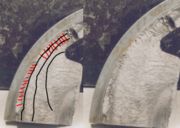 Nell'immagine sono evidenziate in rosso le linee di cresta tipiche della nucleazione, infatti hanno origine proprio dalla gola e si nota un'intensificazione in prossimità del foro (effetto intaglio). Le linee nere, linee di arresto frontali rappresentano l'avanzamento del fronte di frattura.