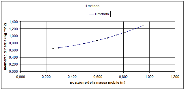 Per il corretto svolgimento di questa parte dell'esperienza è stato necessario seguire un determinato procedimento. In particolare, dopo aver rilevato tutte le misure caratteristiche del pendolo, si è passati alla fase di rilevazione vera e propria dove sono state considerate dieci diverse posizioni della massa mobile lungo l'asta del pendolo. Per ognuna di queste posizioni, dopo aver preventivamente stabilito l'ampiezza di oscillazione (la quale è fissa per tutte le 10 posizioni), si procedeva con la rilevazione dei periodi o più precisamente di dieci periodi per ogni valore di distanza. Una volta terminata questa fase di rilevazione si è passati al calcolo vero e proprio del momento d'inerzia con il suo rispettivo errore. Di seguito saranno riportate in tabella, tutte le rilevazioni eseguite nonché il risultante valore del momento d'inerzia ed in grafico il valore del momento stesso in rapporto alla distanza del centro di massa.